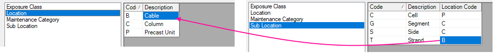 Location and Sub Location allow components and defects to be located within the asset. Sub location items can be filtered by a parent location item, by placing the code of the location in the "location code" column of the sub location.