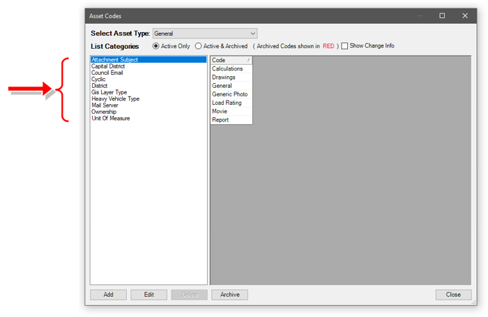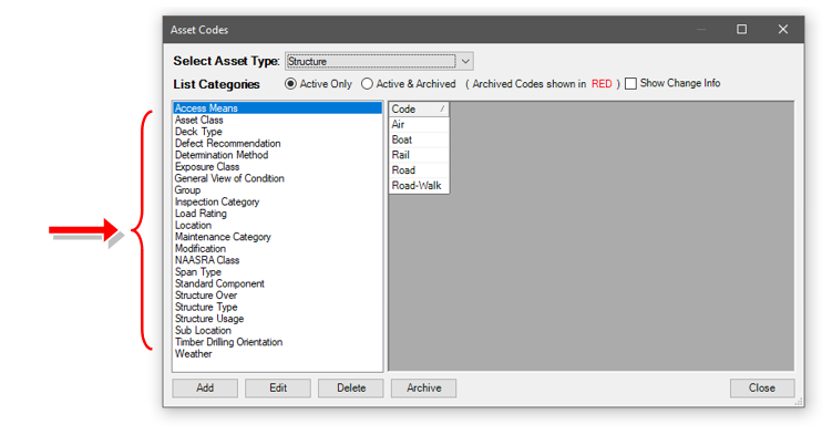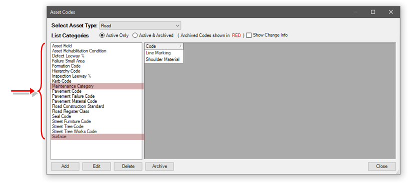 The red highlighted List Categories are important for RoadAsyst® in an operational sense. The remainder are critical for the Capital Editor and the capital aspect of AssetAsyst® with respect to roads.