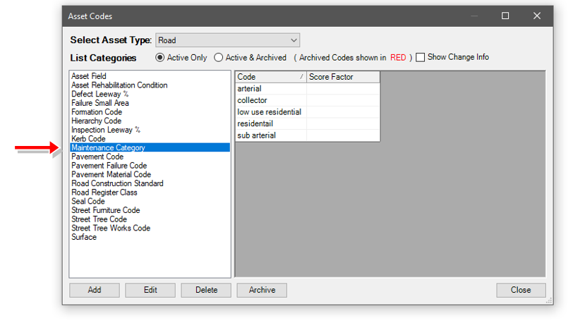 Each segment must be assigned a Maintenance Category (or Hierarchy). The Maintenance Category refers to the group of defects an Authority may have assigned as part of an asset maintenance plan. All assets to be inspected will require a Maintenance Category value to be set.