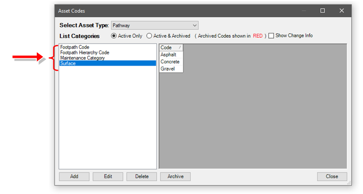 Pathway code table is less complex compared to the road code table. There are limited List Categories to edit.