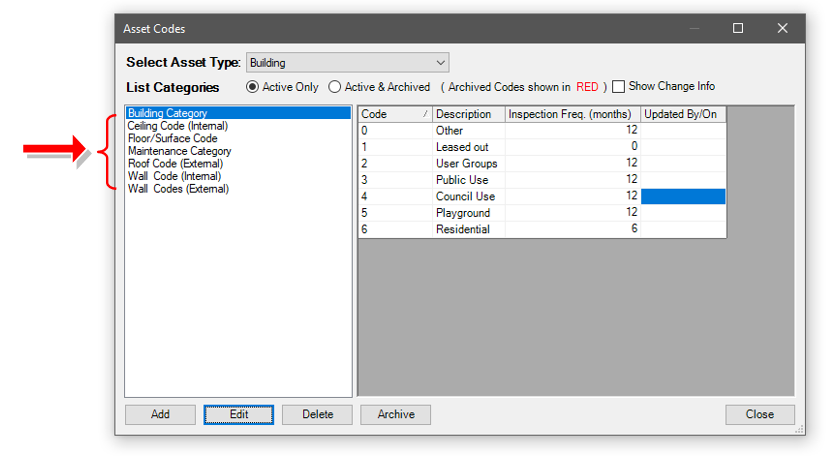 The new maintenance category can be added to the list and then manually added to the relevant assets or units. An alternative method is to edit an existing maintenance category; this will replace any segments containing that category with the new one.