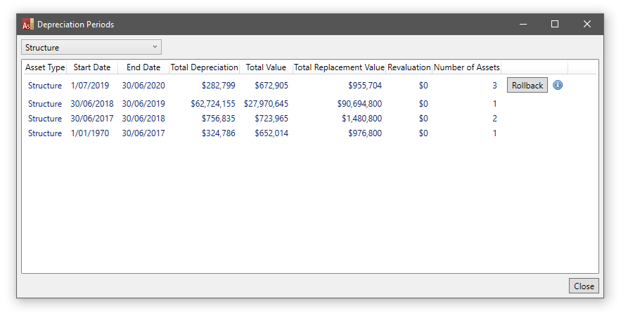 You will see the results of this (and previous) depreciation periods. These periods can be rolled back by clicking the rollback button, but must be done in order, so the most recent period can be rolled back, and then the next most recent.