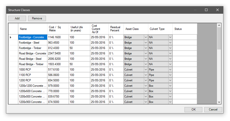 Structure classes define the cost and useful life for various types of structure. A structure class belongs to an asset class – either Bridge or Culvert. Culvert structure classes specify whether they are Pipe culverts or Box culverts. These settings are important as they all impact the algorithm for valuation of a structure.