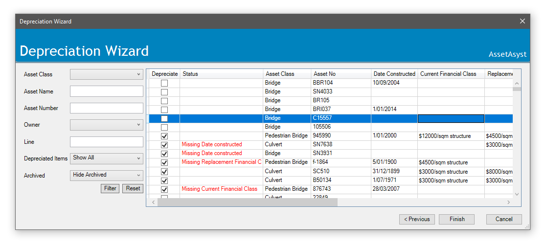 Next, you need to select or review which assets will be depreciated. Only those assets that are ticked as "Depreciate" will be included. If an asset is selected for depreciation, there are several data fields that need to be filled in. If these are not filled in, the software will prompt you to correct them. This can all be done from within this page.