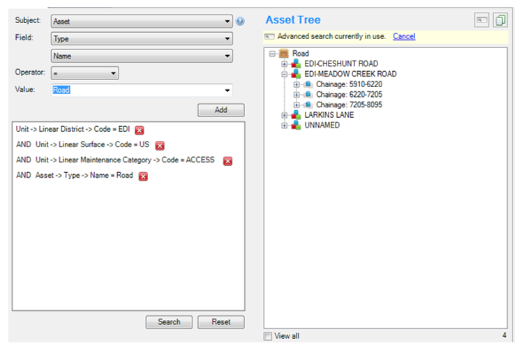 Display in the Asset Tree all road assets that contain a certain district and have a certain surface and maintenance category rated.