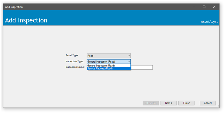To begin select an asset type that the inspection is to be undertaken on and the type of inspection that is to be conducted. Then enter the new Inspection Name into the text box.