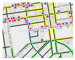 Inspections sets can be created and edited using the map interface. To create or edit an inspection set; first, select the inspection in the Inspection Tree. The window will zoom to the extent of any assets that are to be inspected. The Assets that require inspection but have not yet been inspected will appear yellow in the map, whilst those assets that have been inspected will appear green.