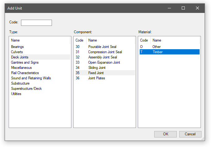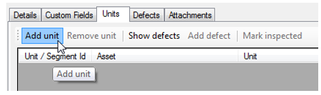 In the Unit tab (sometimes called Component Assessment) of the inspection information form click the Add Unit button. For linear and building inspections, this will display the same dialog that you saw at step 3 of the Inspection Wizard. This will show you all units currently in the inspection set and allow you to add or remove them.