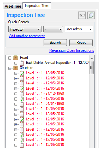 Inspections are represented in the tree by a clipboard icon. When all the units on an inspection have been ticked as inspected, a green tick will appear on the clipboard. This is an indication that the inspection is complete and is ready to be signed off.