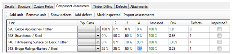 The inspector will indicate how much of each unit is in conditions 1, 2, 3 and 4 (optionally 5) (condition 1 being the best and 4/5 being the worst). For a VicRoads structure, the inspector will enter percentages. For the Queensland methodology, the inspector will enter quantities.