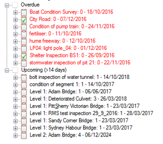 The inspection tree can be ordered in various ways. One of these options categorises inspections by their status (e.g. overdue, upcoming). The inspection tree can be configured in the Tools menu under Options.