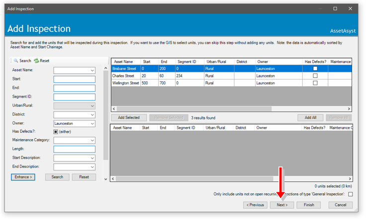 For a road or pavement inspection the next step is to select the units that are to be included in the inspection. AssetAsyst® allows more than one asset to be included in an inspection for linear type assets. Units can be filtered using the tools on the left hand side of the form. Once the relevant units have been filtered in the top data table they can be added to the inspection using the Add Selected button.