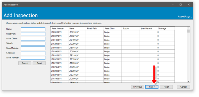 Unlike linear asset types, for bridge and point custom assets, only one asset can be inspected at a time. To select the asset for the inspection simply click the row containing the asset in the list on the right-hand side of the form. Again, there are search functions provided on the left of the form to assist with finding the required asset.