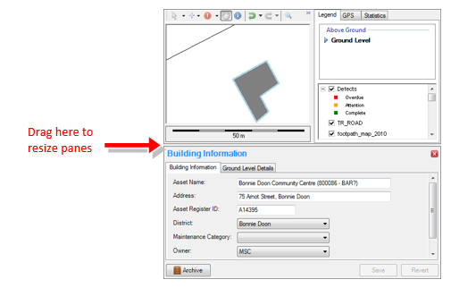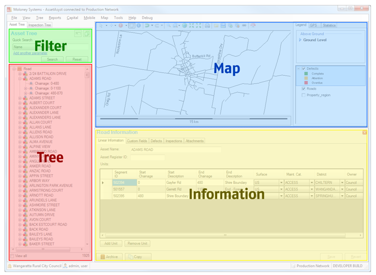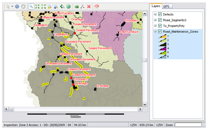 Users can operate the key functions of AssetAsyst® using the map pane. Assets, defects and other mapping layers can be displayed as long as they have a valid projection. If all layer projections are set, AssetAsyst® will automatically handle mixed projections. Inspections and works can be managed through the map interface.