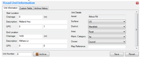 AssetAsyst® is structured such that it will cater for any type of asset by allowing input of common attribute data against each unit. The road asset unit can store information about maintenance category, district, surface, owner and chainages etc., while the bridge asset unit can store information on the quantity of the component and whether or not it is part of an original structure or a widening/lengthening/etc.