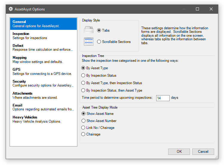 The alternative view can be displayed by toggling between the Tabs and Scrollable Sections radio button on the AssetAsyst® Options form.