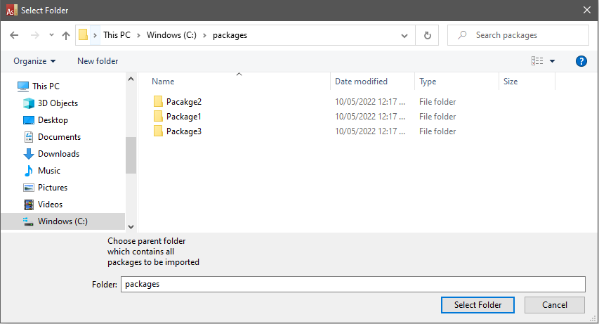 If you have a large number of packages that you want to import on a regular basis, it can be time-consuming to select them one by one and wait for them to import. For this reason, AssetAsyst offers a bulk import option.
