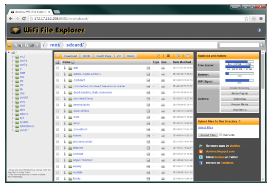 This app gives you an address to type into your web browser. You are then presented with a web-based interface to the file-system of your device.