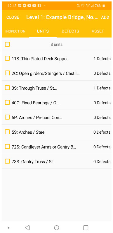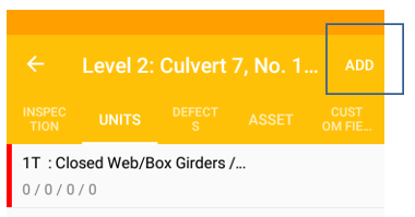 The units page will show a list of all existing components on the asset. If this is the first time the asset has been inspected there may not be any components yet. You can add a new component by tapping the “Add” button.