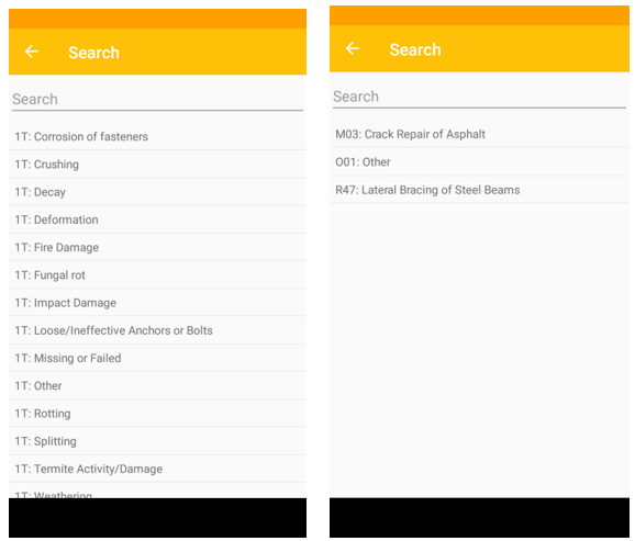 Select a defect type by tapping the button and selecting from the list. Then tap the Repair Type button. The list will automatically filter to those repair items that are relevant to the defect type.