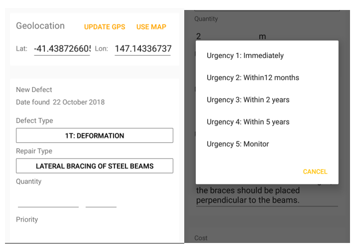Several fields in the defect can be automatically filled by the defect type and repair type. Most notably are the description and repair fields. This default text comes from the defect and repair configuration in AssetAsyst. This can save significant time in the field by reducing the amount of typing that is necessary on the touch screen, but these descriptions can also be edited to customise them as necessary.