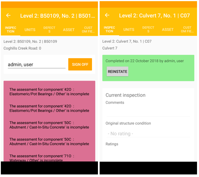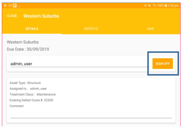 When you have finished, entering the component and defect information, you need to sign off the inspection so that it can be imported back into AssetAsyst®.