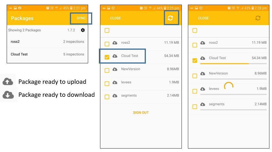 Once you are logged in, the sync page will display a list of packages available, including those on your device, and those in the cloud.