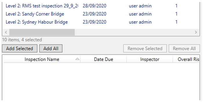 Once you have selected the desired inspections, use the “Add Selected” button. This will move the selected inspections to the bottom grid.
