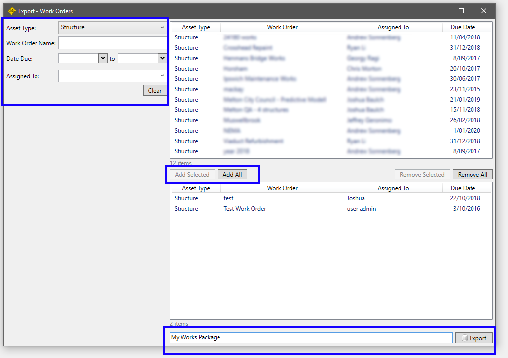 The process of creating a works package is very similar to the process for creating an inspection package. Use the filters on the left to find suitable works packages. Add the desired packages to the bottom list using the Add Selected and Add All buttons. Then give the package a name and *click8 the export button.