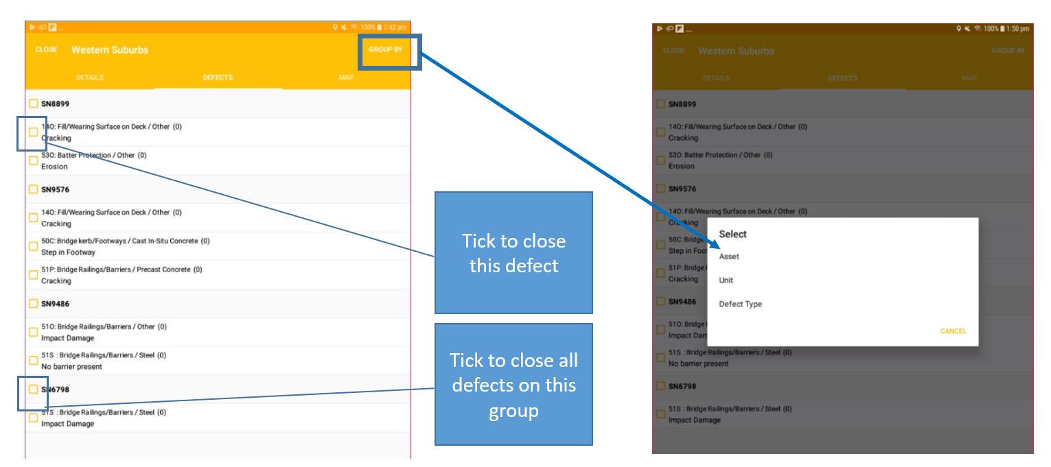 From the defects page, you can tap the checkbox to close defects. You can also group the defects by asset, unit, or defect type, and then close all the defects in a group.