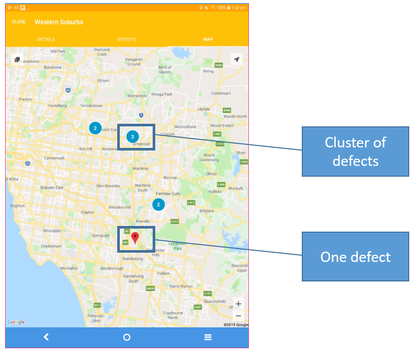 The map page displays the locations of defects. Defects that are close together are clustered. As you zoom in closer, they will seperate.