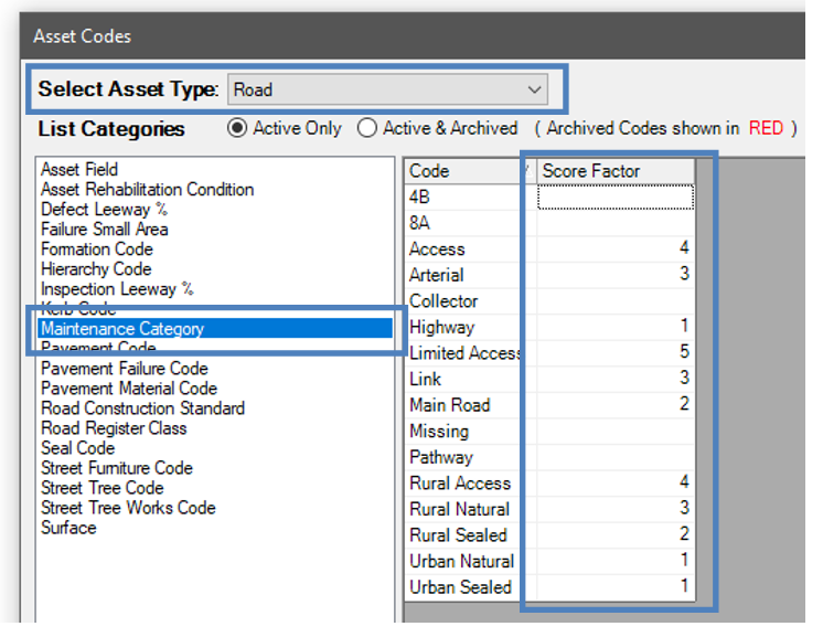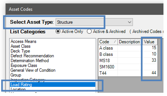 To set the score factors, open the Asset Codes form from the Tools menu. Select the Structure asset type, then the Load Rating category, and enter the desired scores into the Value column.