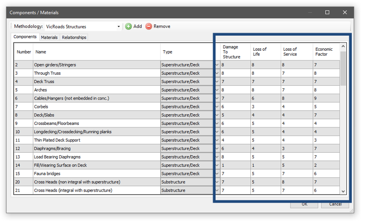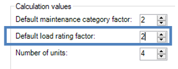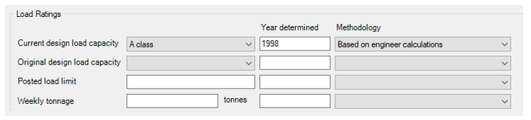 Each structure has a Load Rating, which is set according to the load capacity of the structure when the structure was designed or last assessed. Each load rating has a factor which determines the contribution of the load rating to the overall score. When no load rating has been determined for the structure, the default load rating factor from the risk score calculator is used.