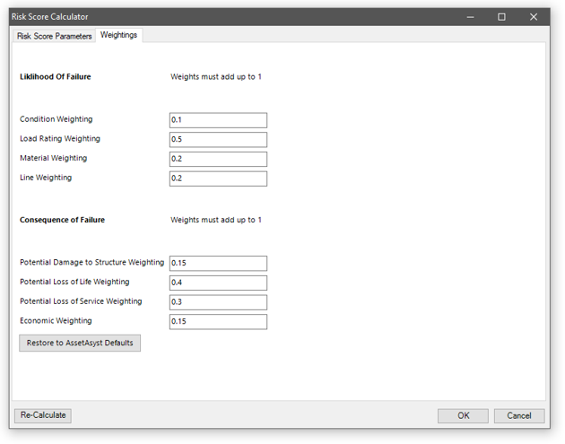 The factors that make up the risk score of a unit are weighted by priority. You can change the priority by adjusting the weightings. At any time, you can click the "Restore to pitt&sherry Defaults" button to reset the weightings to those recommended by the engineers who developed this software. Weightings within a section must add up to 1. The factors are listed below.