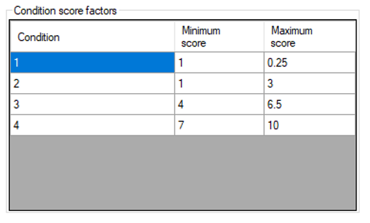The risk score calculator represents score factors as ranges between a minimum and maximum score. If condition 3 has a range between 4 and 6.5, this means that the score for a unit in condition 3 is multiplied by the maximum score, and if the result is less than the minimum score, then the result is set to the minimum score.