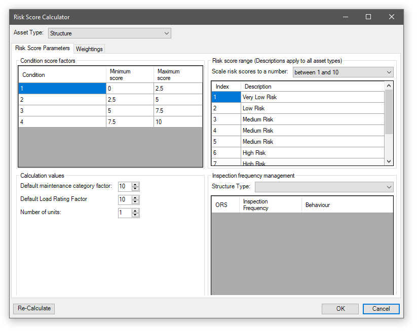 Re-calculate will update the Overall Risk Score for all Structures and Custom Assets. It does this by re-assessing the Overall Risk Score for the most recent Condition Inspection and then applies that figure to the Asset.