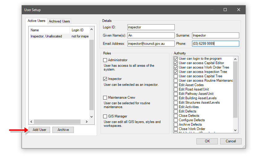 Users can be allocated to a role. Each role allows that user to be allocated to inspection works and/or maintenance works, or conduct more detailed GIS work.