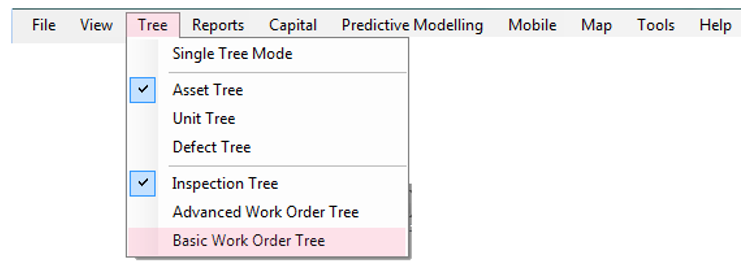To access the Basic Work Order Tree, click the Tree menu and then Basic Work Order Tree. Operationally, works orders can remain open or be closed depending on the preference of the user.