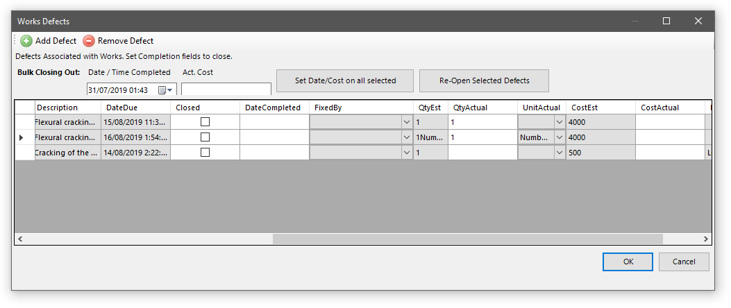 Once again you will see the defects pop-up form. To complete a defect, tick the checkbox in the “Closed” column. The date completed and fixed by columns will be pre-filled for you, but you can override these values if desired. Enter an actual quantity and actual cost.