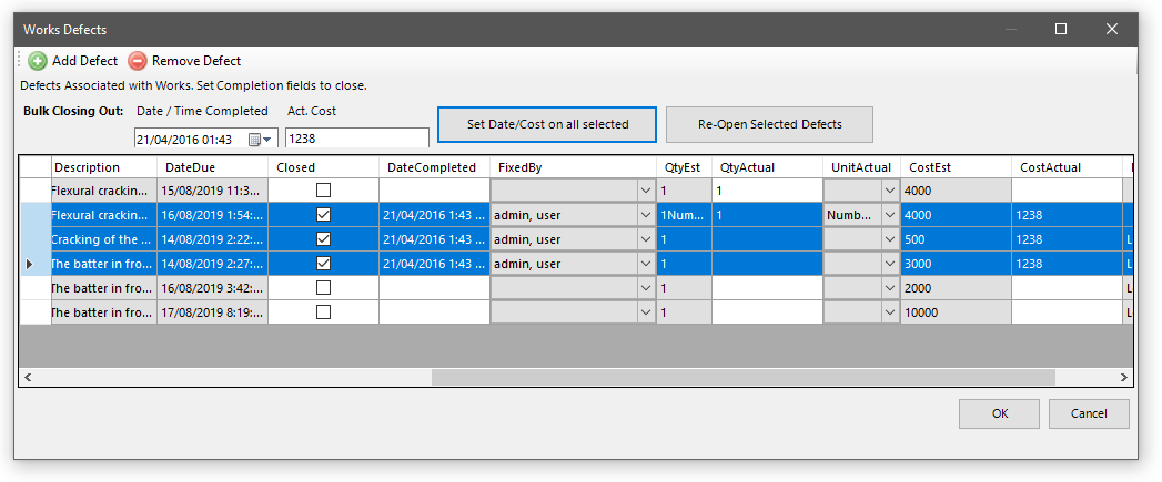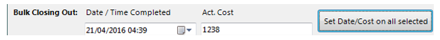 To bulk close defects, select some defects using the row header. Then enter a date/time and cost into the control at the open, then click the “Set Date/Cost on all selected” button.