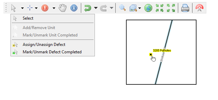 Select a Work Order from the Tree, select the option Mark/Unmark Defect Completed from the map toolbar Select menu, and select one or more defects in the map window. This will close the defect and open the Defects form for entry of additional details such as actual cost and quantity.