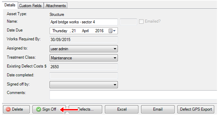 As with inspection sets, users can Sign Off a works order. Clicking the Sign Off button will archive the works order. Any defect which has not been completed on the signed off work order will be returned to the pool of defects not attached to any works order. Those defects can then be allocated to another open work order.
