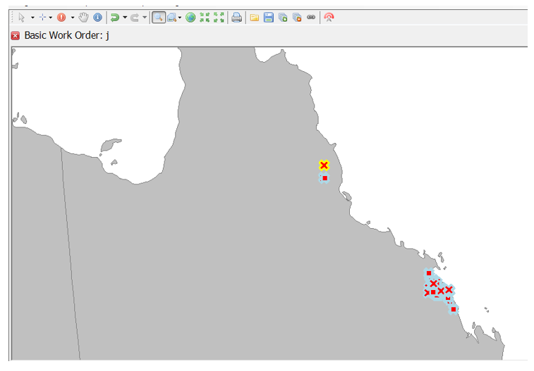 Each Basic Work Order stores defects against it. To show defects attached to the work order in the map, select the work order item in the tree, the map will automatically zoom to the extent of defects containing map coordinate data.