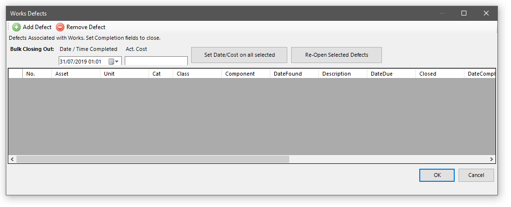 A form will open displaying all defects currently attached to this basic work order. If it is a new work order then the grid will be empty.